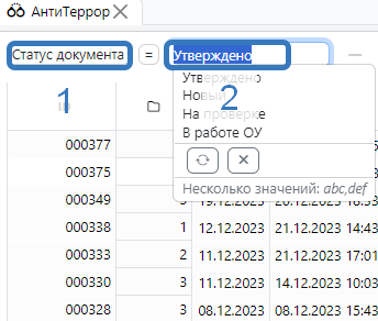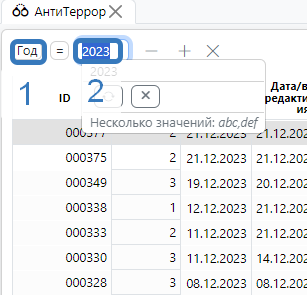 После нажатия кнопки в верхней части экрана появится строка. В поле слева (1) выбирать графу, по которой хотим установить фильтр, в поле справа (2) вводим значение, по которому хотим отфильтровать строки (рис. 3).