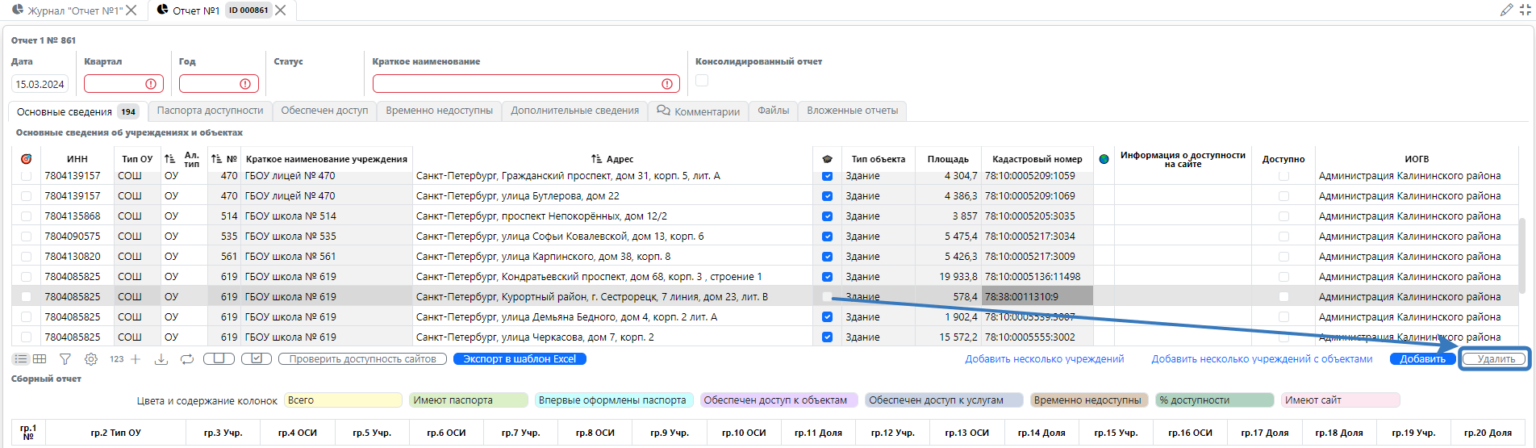 В рамках заполнения данного отчета — учету подлежат только те объекты учреждений, на которых предоставляются услуги населению, а именно непосредственно осуществляется образовательная деятельность, отмеченные маркером в графе «Осуществление образовательной деятельности», и объекты учреждений, в которые есть доступ у населения в рамках оказания услуги (например, спальные корпуса и др.). Иные объекты необходимо исключить, выделив каждую строку курсором мыши и нажатием кнопки «Удалить» (рисунок 10).