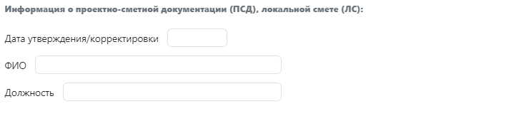 — Заполните информацию о проектно-сметной документации, локальной смете в части даты утверждения/корректировки, ФИО и должность утвердившего ПСД/локальную смету. Для типов работ «Оборудование…» сведения не заполняются (рис. 12).