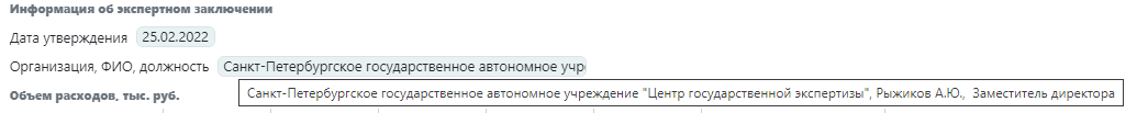 | Блок выводится на печать в адресной программе в графе «Реквизиты документов по экспертизе ПСД, ЛС, Наименование организации, утвердившей экспертное заключение» |
