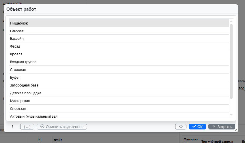 для мероприятия «капитальный ремонт помещений пищеблока» с типом работ «Капремонт» , следует выбрать соответствующий пункт из списка (в данном случае, «Пищеблок»);