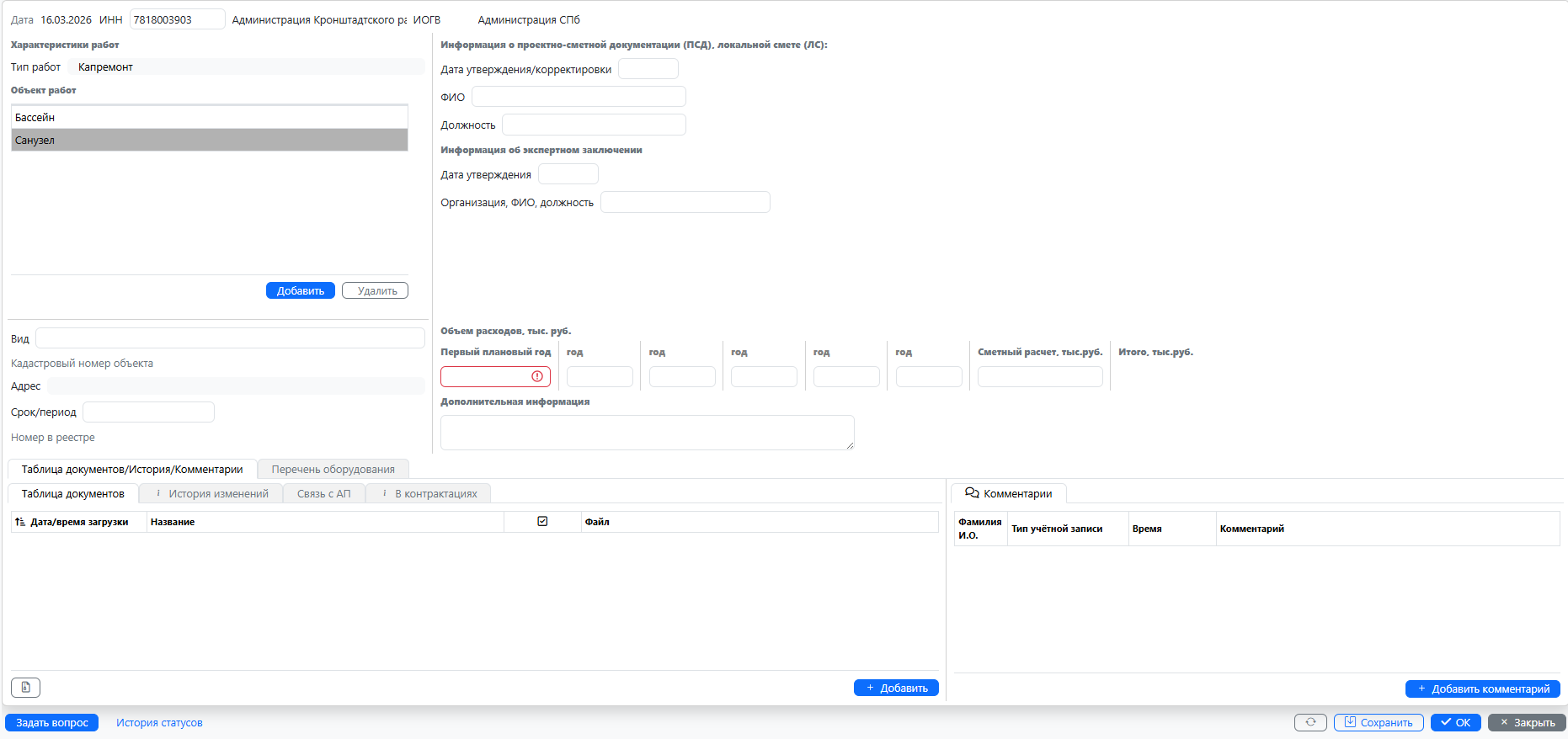 для мероприятия «капитальный ремонт бассейна и санузлов 2 этажа» с типом работ «Капремонт», включающего ремонт нескольких объектов, следует их выбрать из списка — в данном случае «Бассейн» и «Санузел».