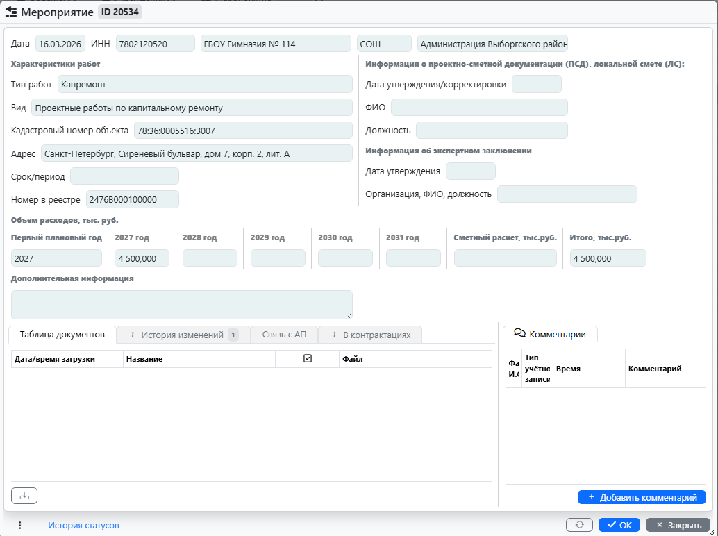 На рисунке 5 приведен пример утвержденной карточки документа по одному из мероприятий.