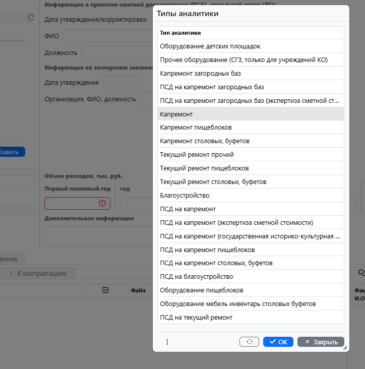 — Выберите [highlight:lemon-yellow]тип работ[/highlight] из справочника «Типы аналитики» (рис. 8). Обратите внимание! Для мероприятий по проведению капитального ремонта пищеблоков, столовых, буфетов, приобретению оборудования для пищеблоков, столовых, буфетов созданы отдельные типы работ.
