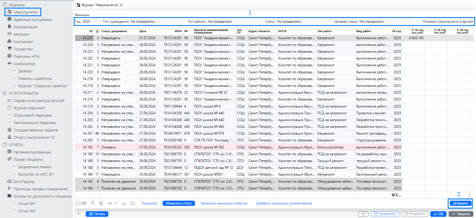 Перед созданием нового мероприятия, в целях исключения создания дубликатов, проверьте его наличие в системе. Для этого при помощи фильтров (1) укажите соответствующие сведения в графах «Год», «Тип ОУ», «Объект работы», «Тип работы», «Статус» и другие.