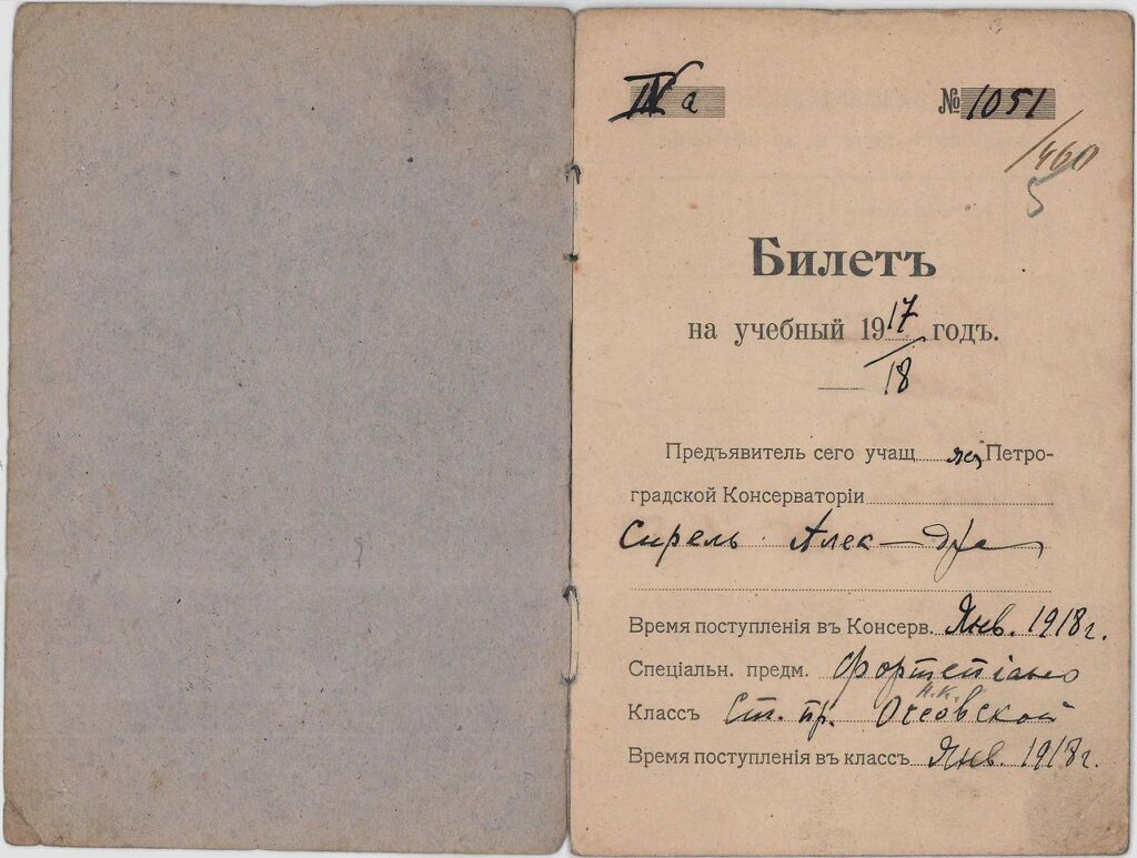 Сирель Александра Студенческий билет студентки Петроградской консерватории [соврем. – ФГБОУ ВО «Санкт‑Петербургская государственная консерватория имени Н.А. Римского‑Корсакова»] Сирель Александры за 1917/1918 учебный год.