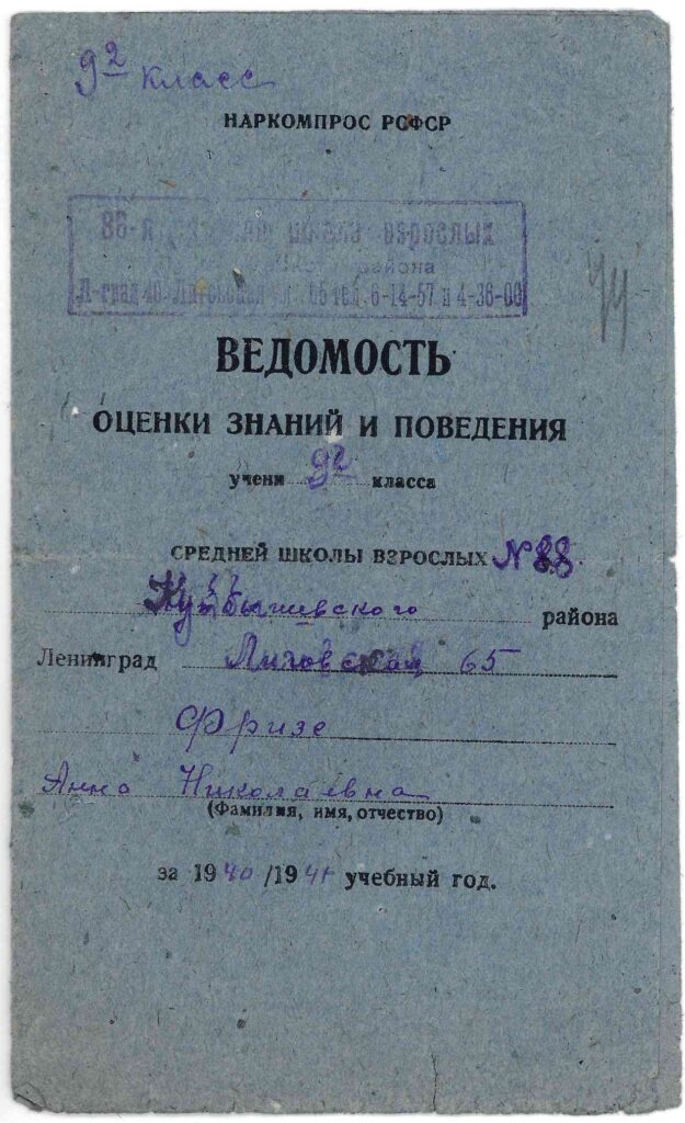 Фризе Анна Николаевна Ведомость оценки знаний и поведения ученицы средней школы взрослых № 88 Куйбышевского района г. Ленинграда Фризе Анны Николаевны за 1940/1941 учебный год.