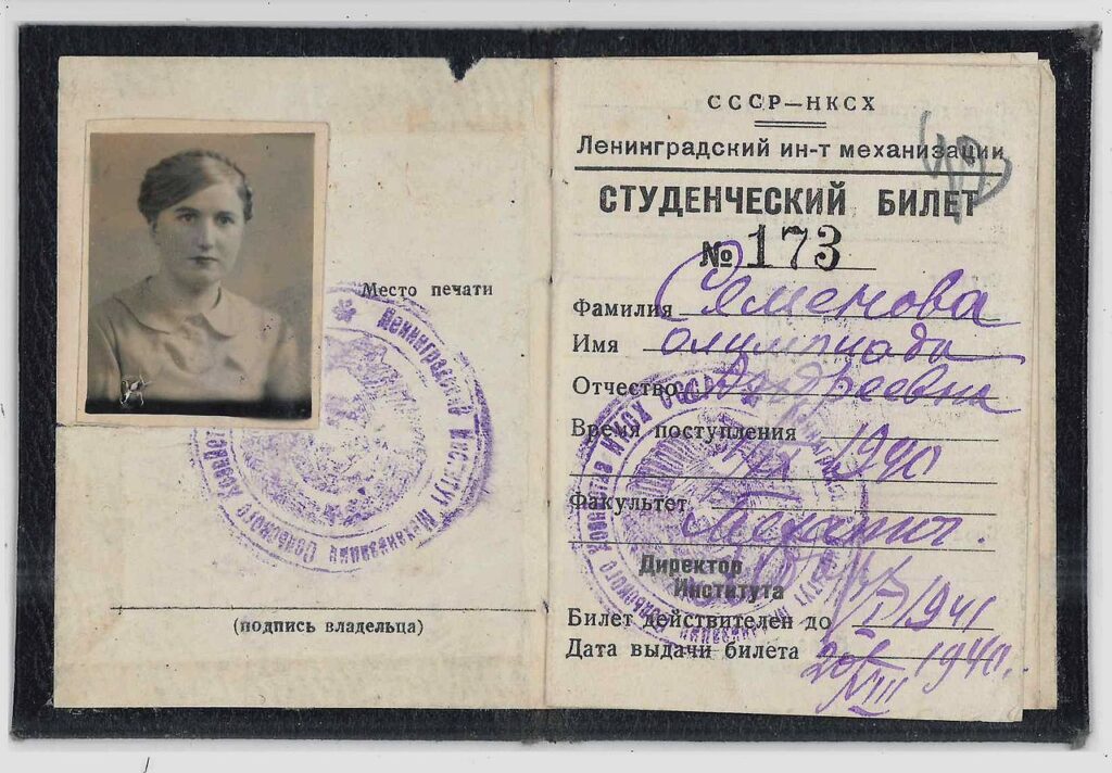 Семенова Олимпиада Андреевна Студенческий билет студентки Механического факультета Ленинградского института механизации сельского хозяйства [соврем. – ФГБОУ ВО «Санкт‑Петербургский государственный аграрный университет»] Семеновой Олимпиады Андреевны за 1940/1941 учебный год.
