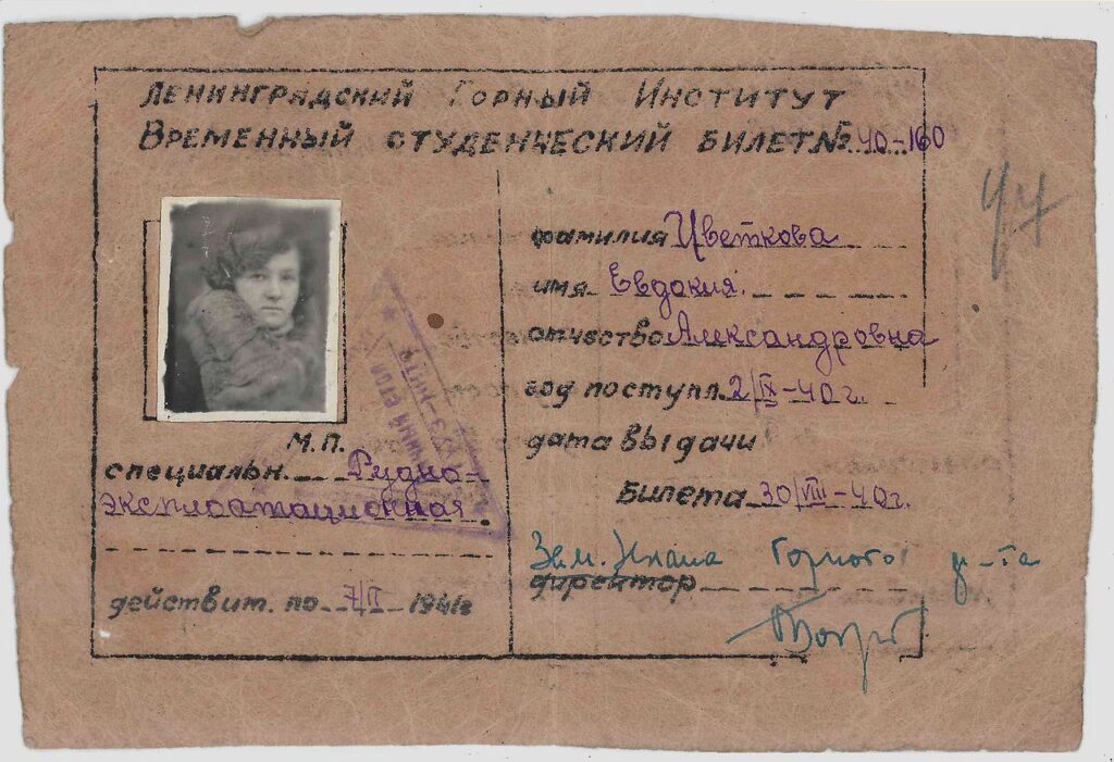 Цветкова Евдокия Александровна Временный студенческий билет студентки Ленинградского Горного института [соврем. – ФГБОУ ВО «Санкт‑Петербургский горный университет»] Цветковой Евдокии Александровны за 1940/1941 учебный год.