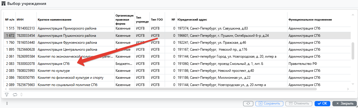 При нажатии на кнопку «Добавить консолидированный», открывается окно «Выбор учреждения». Для создания сводного отчета по Санкт-Петербургу выберите значение [highlight:mint-green]Администрация СПб[/highlight] и нажмите «ОК».