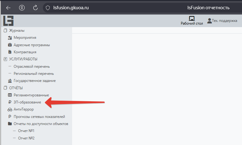 Для начала работы по формированию отчета на верхней панели системы выберите раздел «Рабочий стол», далее перейдите в боковое меню, последовательно выбрав раздел «Журналы» — «Отчеты», подраздел «ЗП-образование».