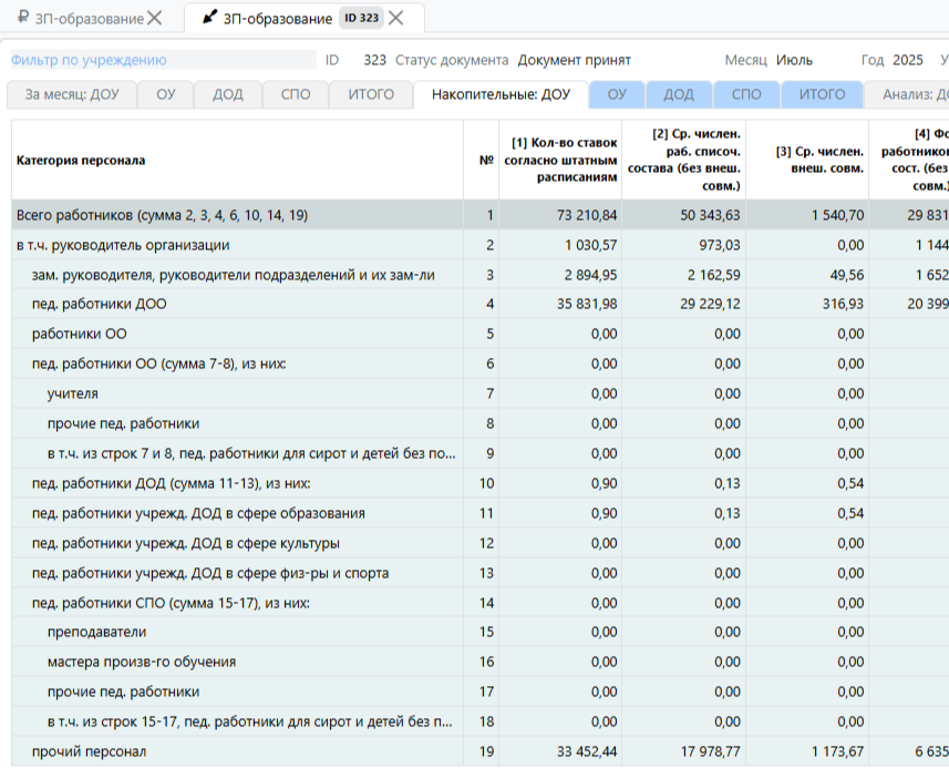 Вкладка Накопительные: ДОУ, ОУ, ДОД, СПО, ИТОГО содержит данные из отчетов администраций районов города и иных ИОГВ (данные рассчитываются автоматически из отчетов, на вкладке «Вложенные отчеты»).