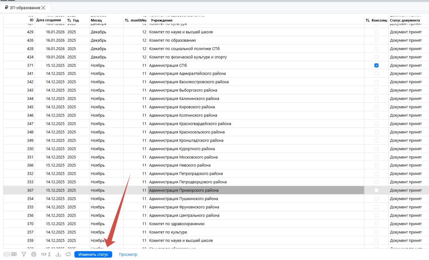 Для этого перейдите в журнал отчеты «ЗП-образование», выберите документ и нажмите кнопку «Изменить статус», находящуюся в нижней части экрана. Выберите статус «Документ принят» и нажмите «ОК».