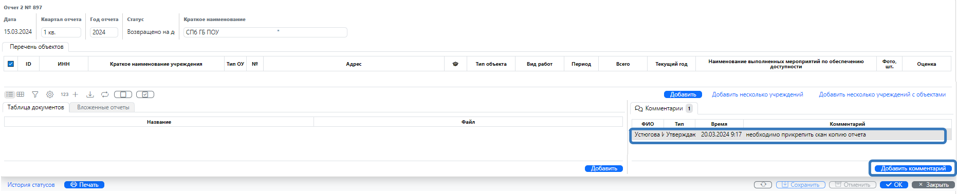 ВАЖНО! Предусмотрена возможность для всех добавлять комментарии к отчету. Для добавления комментария необходимо нажать на кнопку «Добавить комментарий» в нижней части экрана и заполнить ячейку комментарий.