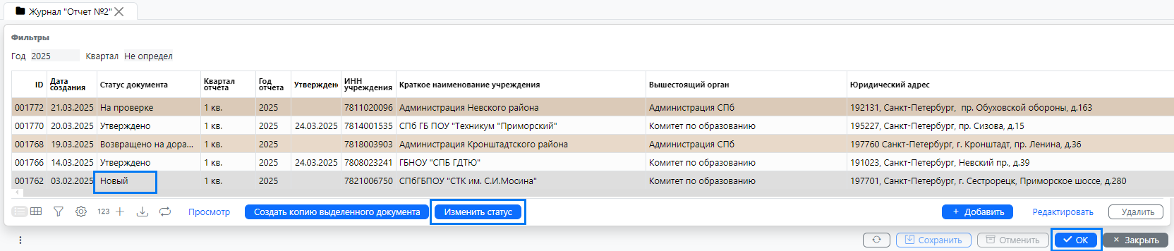 — «Утверждено» — устанавливается в случае успешного прохождения проверки и включения сведений отчета в консолидированный Отчет №2. В этом статусе документ не доступен для редактирования;\