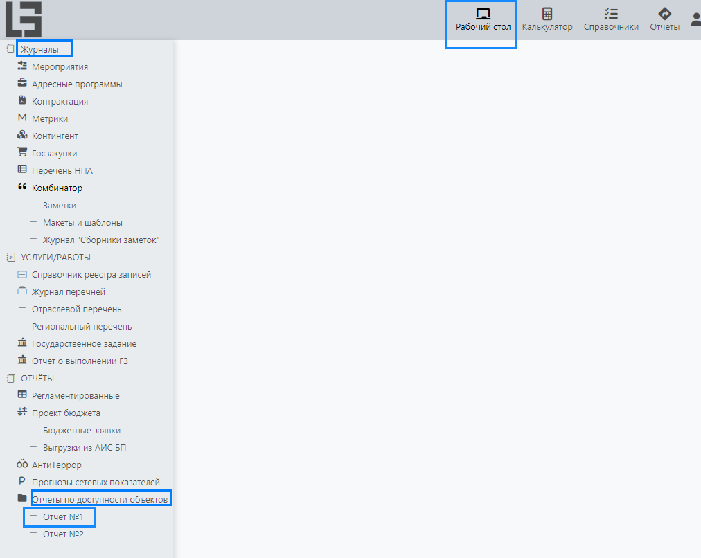 Для начала работы по формированию отчета, на верхней панели Системы выберете раздел «Рабочий стол», далее перейдите в боковое меню, последовательно выбрав раздел «Журналы», подраздел «Отчеты по доступности объектов» / «Отчет №1» (рисунок 1).