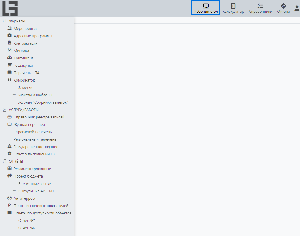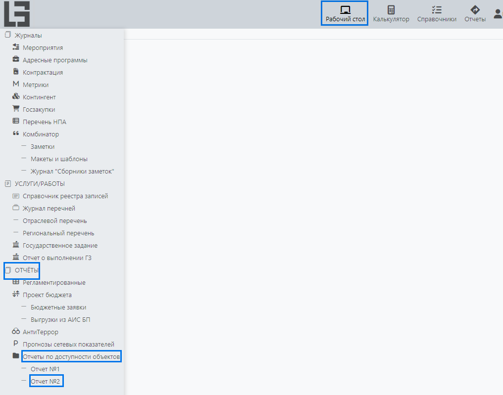 1.1. Для начала работы по формированию отчета откройте меню «Рабочий стол» (рис.1)