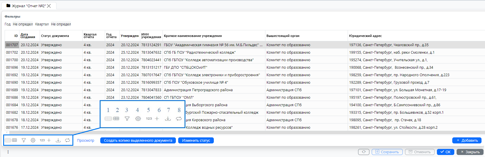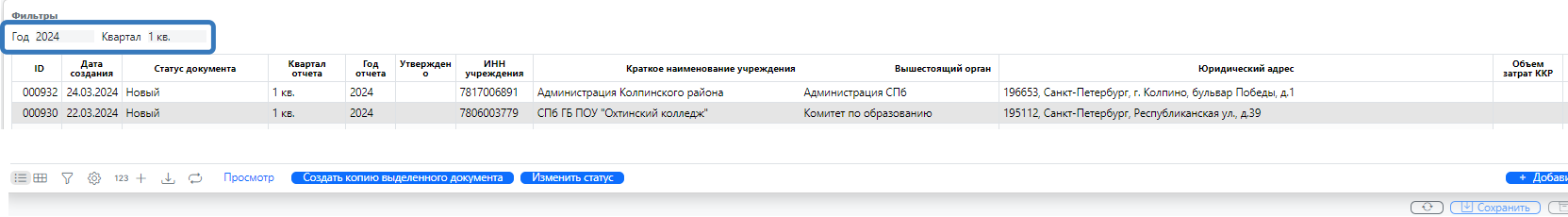 1.3. Для более быстрого и эффективного поиска ранее созданных отчетов в Журнале «Отчет №2» можно использовать фильтры, которые находятся в верхней части экрана (рис. 3): год, квартал.