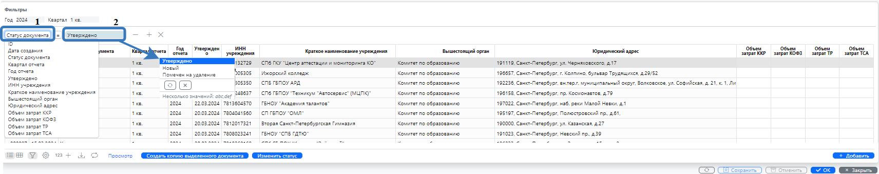 Помимо закрепленных фильтров можно использовать системные фильтры, для этого нужно во вновь созданном отчете нажать кнопку из «Нижнего меню» экрана «Показать настройки фильтров» в отчете (рис. 5). После нажатия кнопки в верхней части экрана появится строка с установленными фильтрами. В поле слева верхней части экрана (рис.5 кнопка 1) выбираем графу, в которой необходимо установить фильтр, в следующем поле (рис.5 кнопка 2) необходимо ввести значение, по которому следует отфильтровать строки.