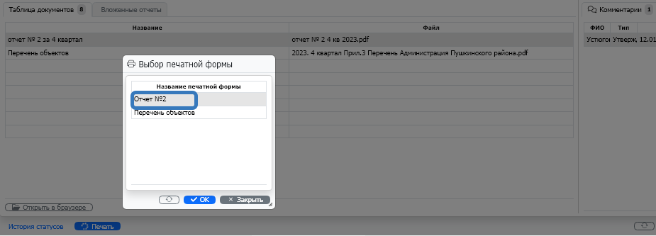 Для печати отчета нажмите на кнопку «Печать отчета» (рис. 21), выберете Отчет № 2 и нажмите кнопку «ОК».