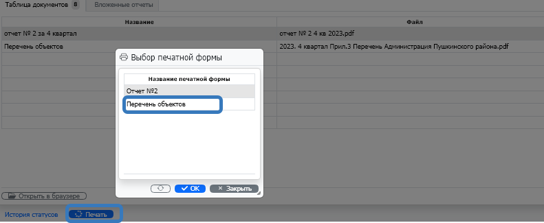 Для печати перечня учреждений и объектов выберете «Перечень объектов» и нажмите «ОК». (рис. 22).