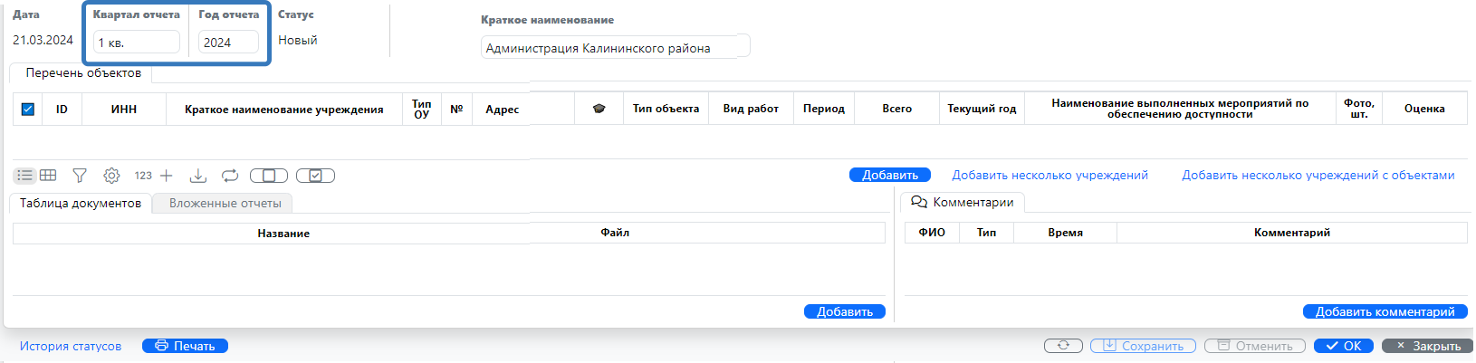 2.2. После этого откроется отчетная форма, которая содержит следующие параметры: