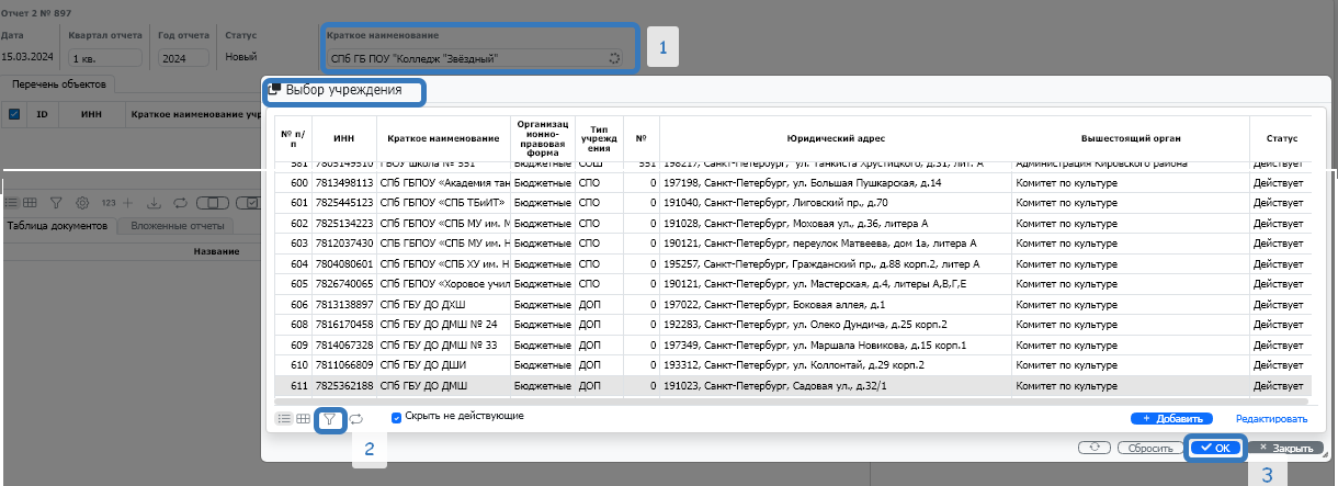 2.3. Для выбора необходимого названия организации нажмите на поле «Краткое наименование» (рис.10 кнопка 1), в открывшемся окне выберете организацию по фильтру (рис.10 кнопка 2). Далее выберете организацию и нажмите кнопку «OK» (рис.10 кнопка 3), или нажмите двойным щелчком по строке с необходимой организацией.