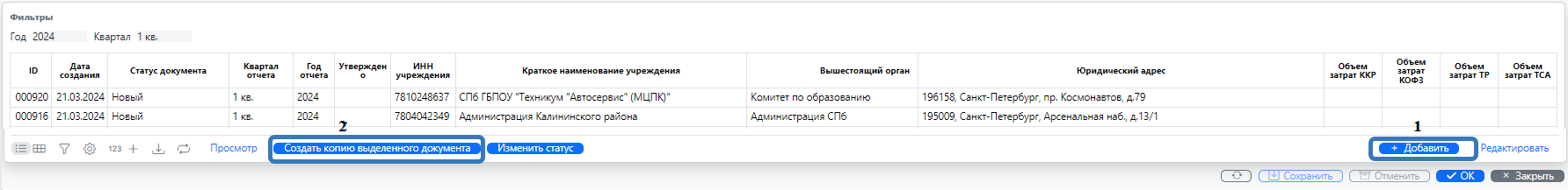 2. Через кнопку «Создать копию выделенного документа» (рекомендованный вариант). Кнопка доступна в списке отчетов со статусом «Утверждено». Кнопка расположена в правой нижней части экрана (рис. 8 кнопка 2).